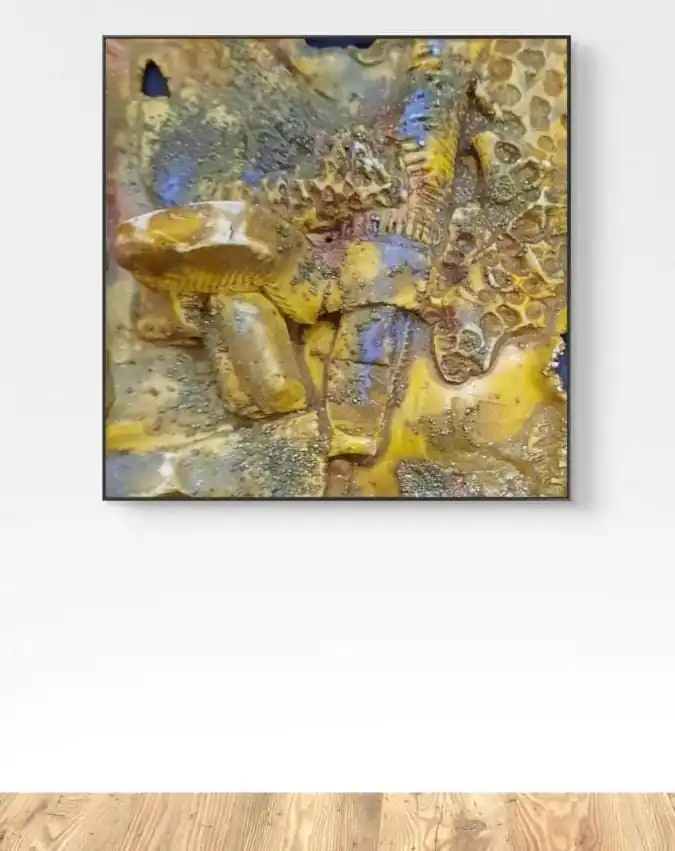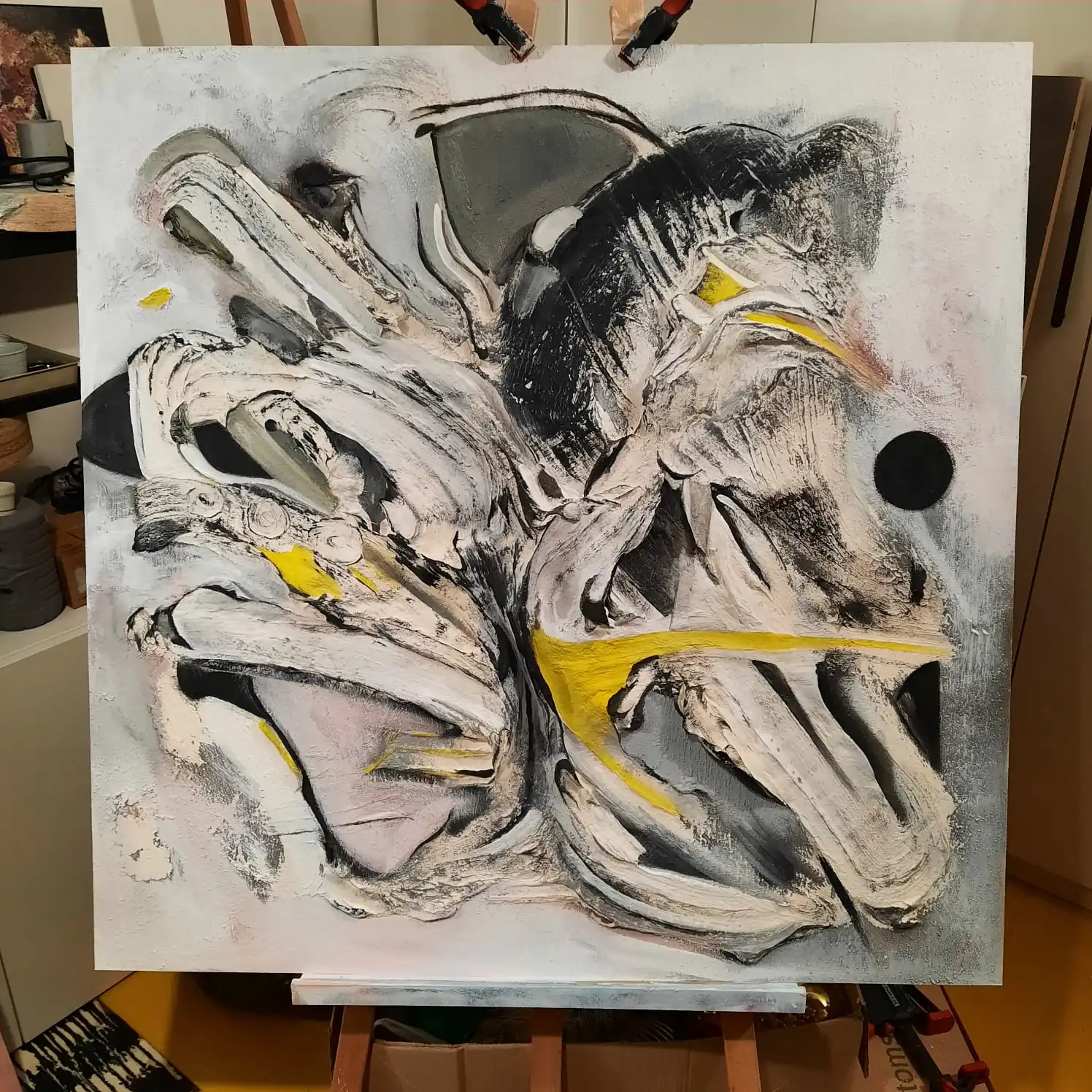 Rekla bih rad, a ne trenutak. Iako trenutak uvjetuje rad, a rad je rezultat trenutka. Riječ je o slici “Na žutom tragu”, koja je davno idejno postavljena, a njezino rezultiranje nastajalo je u fazama vlastitog otkrivanja kao izlaska iz zatvorenih stvaralačkih tokova. U radu “Na žutom tragu” gradim slojevit i materijalno snažan vizualni reljef, u kojem se boja i struktura pretvaraju u semiotički zapis. Dominacija žutog tona nije tek koloristički odabir, nego konceptualni trag: žuta ovdje funkcionira kao energija, puls, signal prisutnosti i svjetlosti, ali istovremeno i kao sediment vremena koji se taloži, raspada i ponovno obnavlja. Reljefna površina, izgrađena kombiniranom tehnikom, otkriva postupak koji je istodobno intuitivan i discipliniran. Tekstura djeluje poput arheološkog presjeka – u njoj je moguće čitati geologiju emocije, naslage memorije i krhke fragmente iskustva. Organske formacije, neravni otisci i mikroskopski detalji stvaraju osjećaj da je površina živa, da diše, mijenja se i nosi vlastito pamćenje. U ovom radu ne bavim se naracijom u klasičnom smislu, već vizualnom topografijom koja se otvara promatraču kao prostor samostalnog tumačenja. Na žutom tragu postaje karta bez fiksnog odredišta – put kojim se krećemo slijedeći tragove boje, materije i intuicije, sve do trenutka u kojem se promatrač i djelo povezuju u intimnom, tihom dijalogu. Plavi, zemljani i metalni akcenti razbijaju dominaciju žutog uvodeći ritam i suptilnu ravnoteža između svjetline i težine, organskog i mineralnog, unutarnjeg impulsa i vanjske manifestacije. Rad time postaje vizualni i taktilni organizam – otvoren, fluidan, procesualan. “Na žutom tragu” nije tek slika, nego prostor postajanja. Ona ne sugerira dovršeni oblik, nego trajanje: trag koji se ne briše, nego razvija, transformira i nastavlja živjeti u pogledu onoga koji promatra. U tom smislu, ova je slika moj trag u prostoru vlastite transformacije za stvaranje nekih drugih zapisa, otisaka, tragova. Ponekad, neovisno o zdravstvenom stanju, pojedinac traži vlastito obojanje i pretvorbu u znak na svom putu. Moji nekadašnji tragovi jesu potreba za poučavanjem kroz rad sa djecom i mladima sve do trenutka kad je vlastita snaga bila jača i važnija od zapisanih stereotipa društva o jasnom cilju kasnih 20-ih godina života. Složit ću se s ljepotom pojedinca koji osjeća vlastiti cilj, ali nikako ne želim umanjiti stalnu potrebu za promjenama, novim otkrivanjima jer suštinski život nam je dar koji treba slijediti birajući vlastito svjetlo.